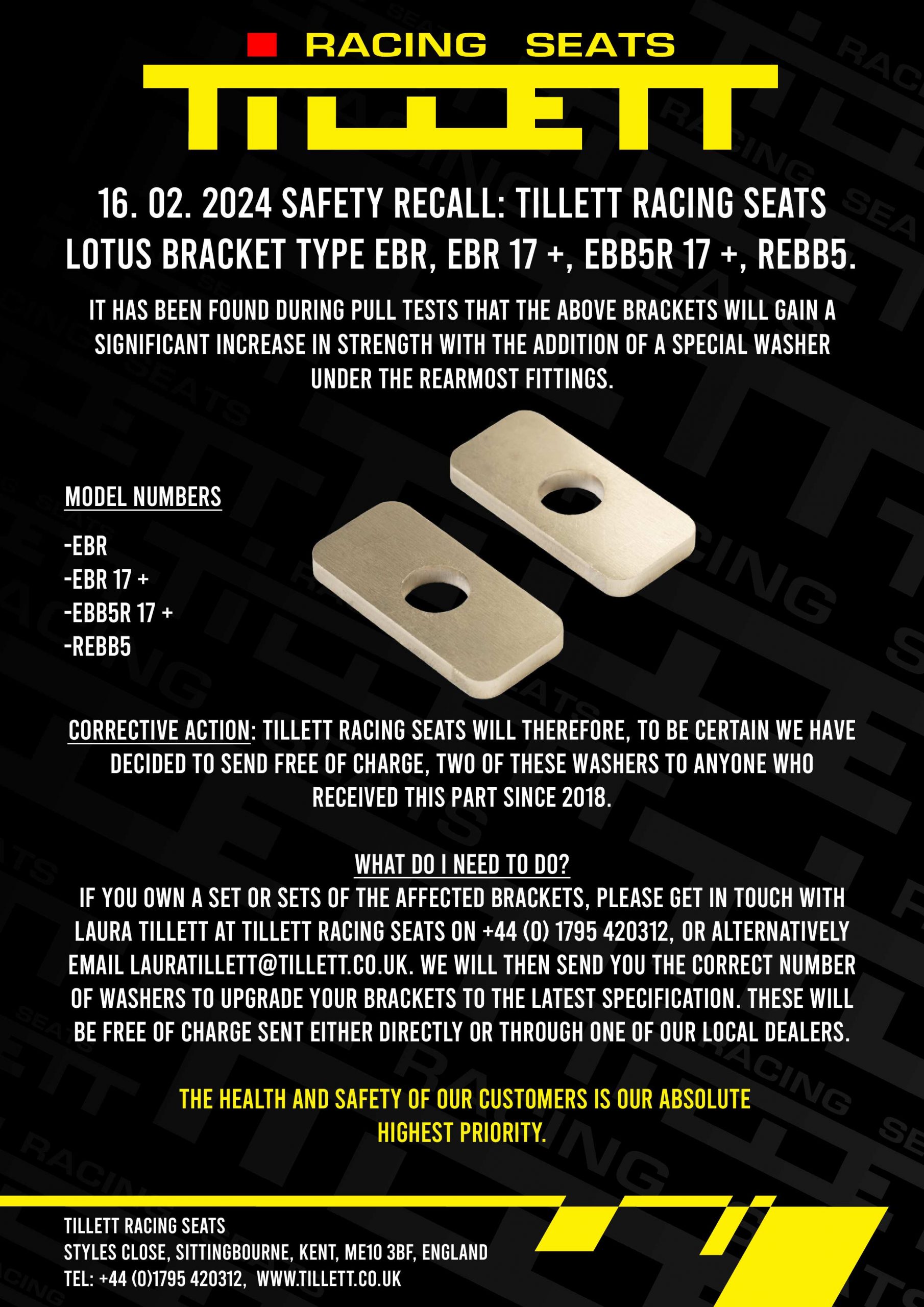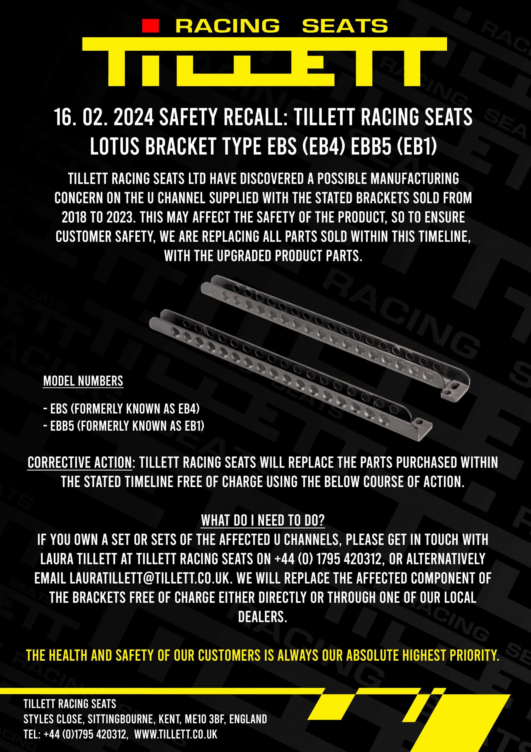 Nothing is more important to us than the safety of our customers. Therefore, Tillett Racing Seats LTD is issuing a recall on the following products: